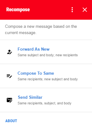 Compose to Same lets you compose a new message to an existing group of recipients. It opens a draft with blank subject and body, filling in To, Cc, and Bcc from the current message.